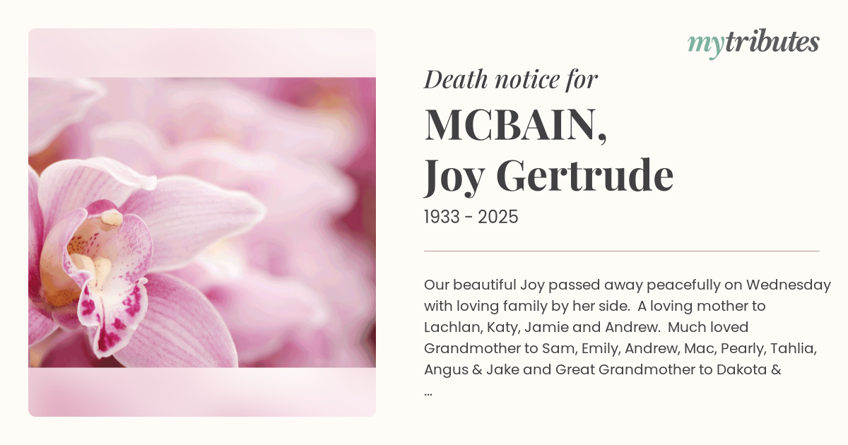 Our beautiful Joy passed away peacefully on Wednesday with loving family by her side. A loving mother to Lachlan, Katy, Jamie and Andrew. Much loved Grandmother to Sam, Emily, Andrew, Mac, Pearly, Tahlia, Angus & Jake and Great Grandmother to Dakota & Maxwell. Mother In-Law to Julie, Peter, Lisa & Danielle. Adored sister of Kay and beloved aunt of Sally, Heath & Dean.
