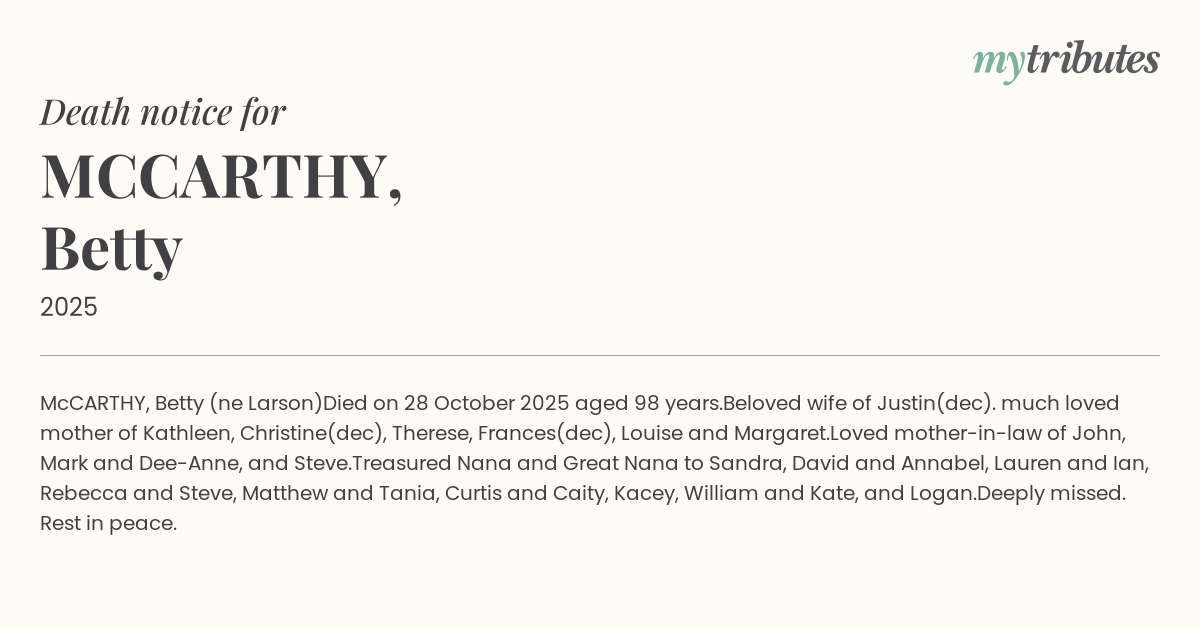 Beloved wife of Justin(dec). much loved mother of Kathleen, Christine(dec), Therese, Frances(dec), Louise and Margaret.