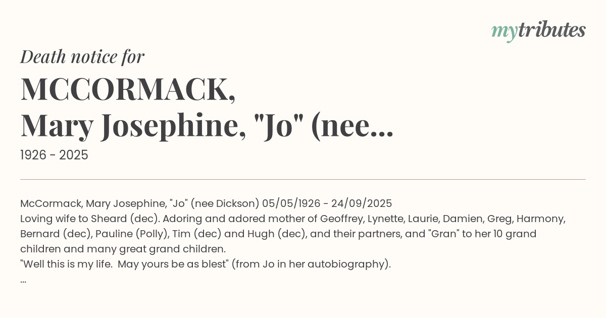 McCormack, Mary Josephine, "Jo" (nee Dickson) 05/05/1926 - 24/09/2025