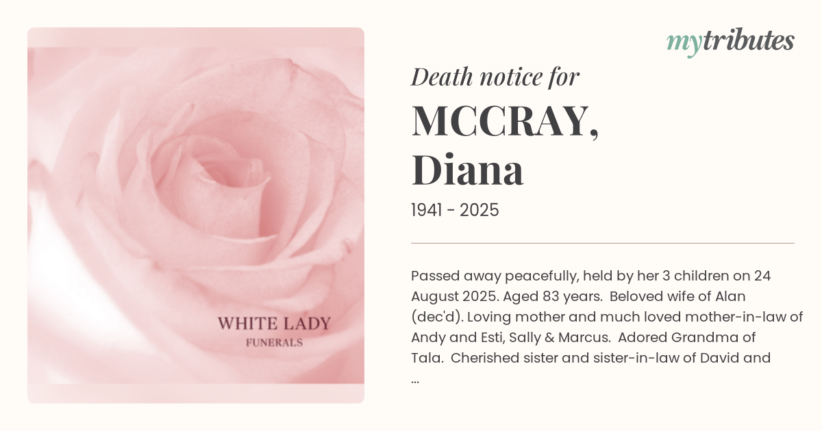 Passed away peacefully, held by her 3 children on 24 August 2025. Aged 83 years. Beloved wife of Alan (dec'd). Loving mother and much loved mother-in-law of Andy and Esti, Sally & Marcus. Adored Grandma of Tala. Cherished sister and sister-in-law of David and Sharon, Ros and Richard (dec'd). Gina, John and Morna, Margie and Phil and Jean. Privately Cremated.