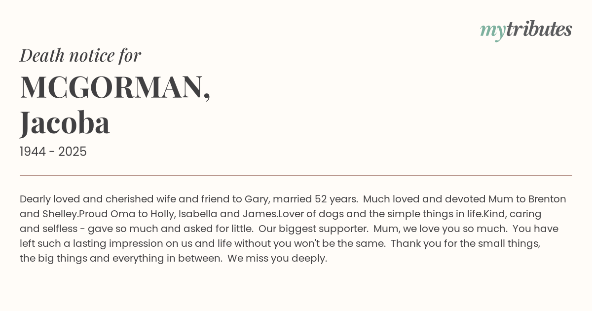Mum, we love you so much. You have left such a lasting impression on us and life without you won't be the same. Thank you for the small things, the big things and everything in between. We miss you deeply.