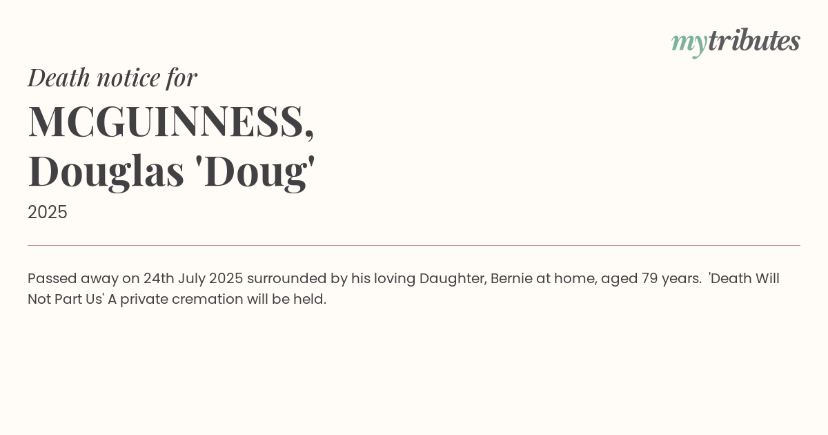 Passed away on 24th July 2025 surrounded by his loving Daughter, Bernie at home, aged 79 years. 'Death Will Not Part Us' A private cremation will be held.