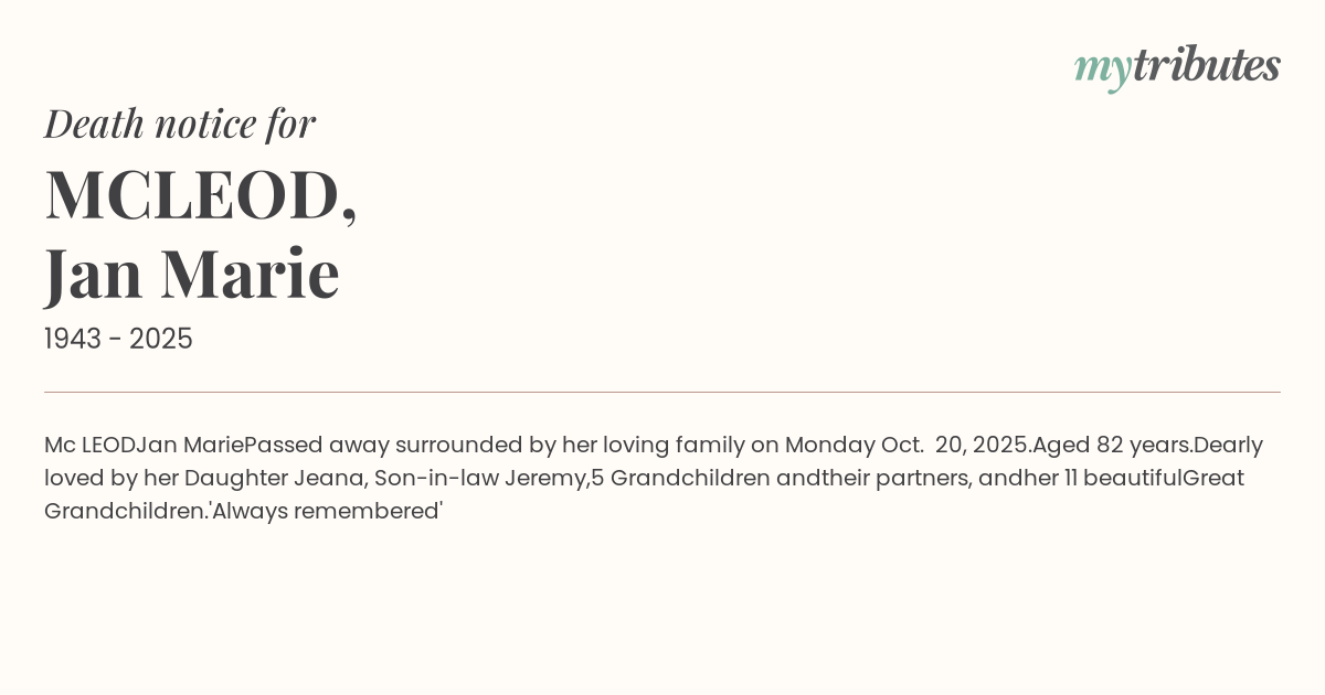 Passed away surrounded by her loving family on Monday Oct. 20, 2025.
