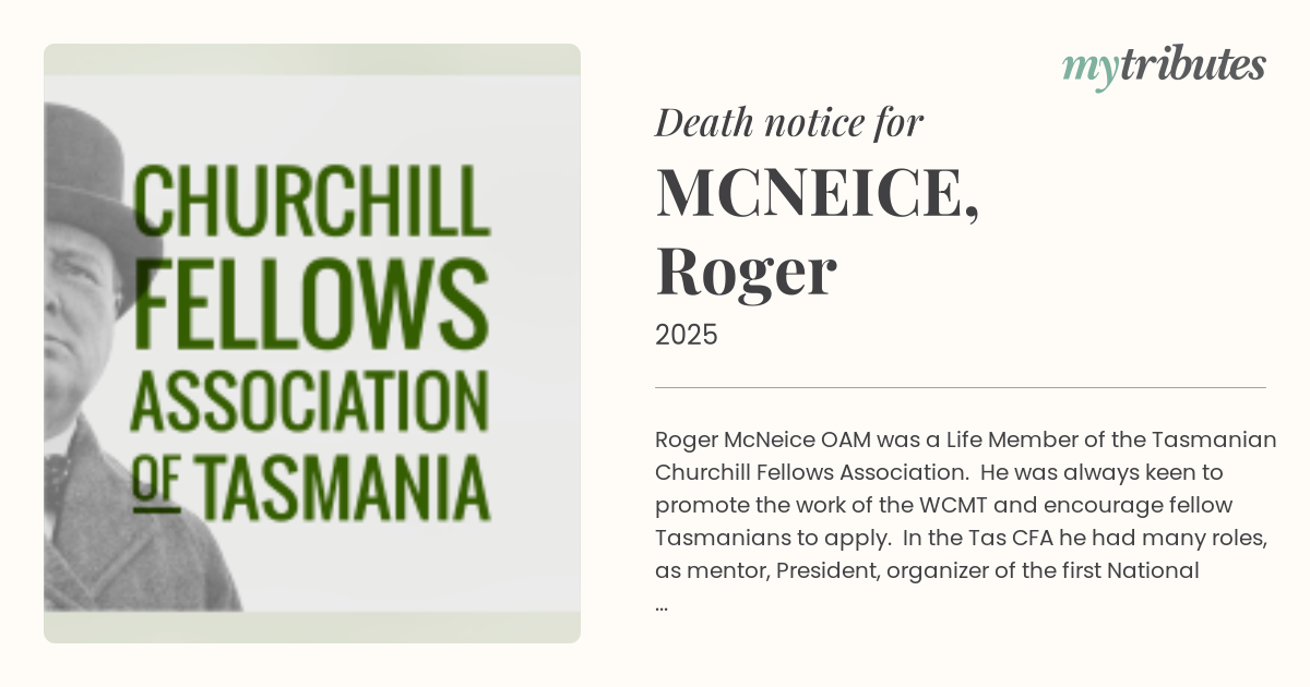 Roger McNeice OAM was a Life Member of the Tasmanian Churchill Fellows’ Association. He was always keen to promote the work of the WCMT and encourage fellow Tasmanians to apply. In the Tas CFA he had many roles, as mentor, President, organizer of the first National Gathering in Tasmania and using his vast numismatic skills, the creator of Churchill Memorabilia to raise funds to go towards fellowships. He will be sadly missed.