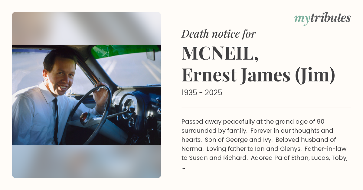 Passed away peacefully at the grand age of 90 surrounded by family. Forever in our thoughts and hearts. Son of George and Ivy. Beloved husband of Norma. Loving father to Ian and Glenys. Father-in-law to Susan and Richard. Adored Pa of Ethan, Lucas, Toby, Ryan, Bailey, Mahala and Erin. Special thanks to Baptcare Peninsula.