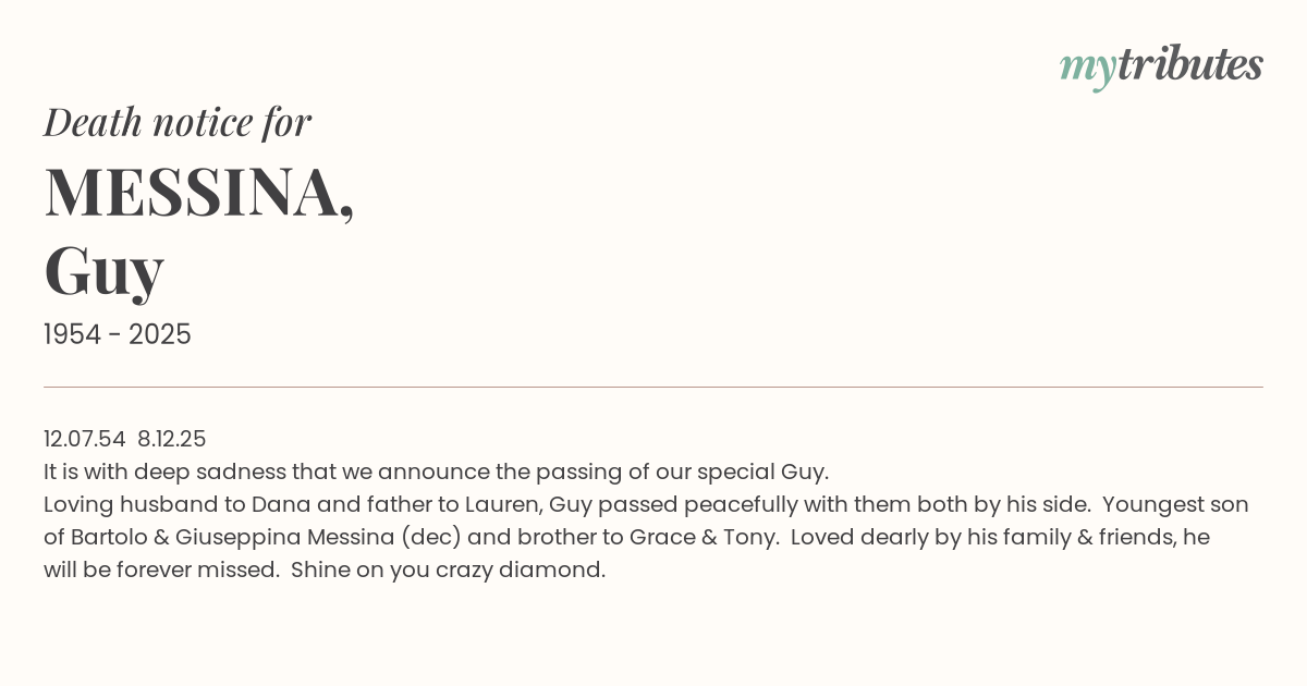 Loving husband to Dana and father to Lauren, Guy passed peacefully with them both by his side. Youngest son of Bartolo & Giuseppina Messina (dec) and brother to Grace & Tony. Loved dearly by his family & friends, he will be forever missed. Shine on you crazy diamond.