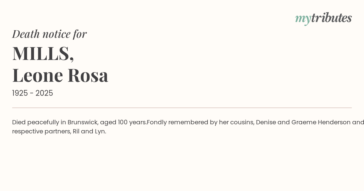 Died peacefully in Brunswick, aged 100 years.