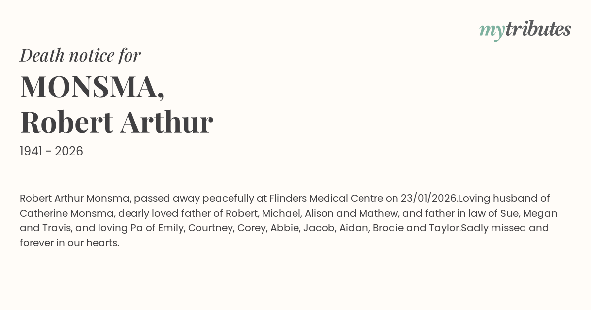 Robert Arthur Monsma, passed away peacefully at Flinders Medical Centre on 23/01/2026.