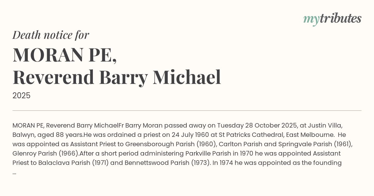Fr Barry Moran passed away on Tuesday 28 October 2025, at Justin Villa, Balwyn, aged 88 years.