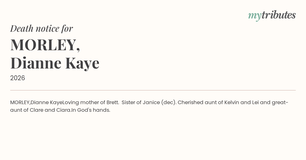 Loving mother of Brett. Sister of Janice (dec). Cherished aunt of Kelvin and Lei and great-aunt of Clare and Ciara.