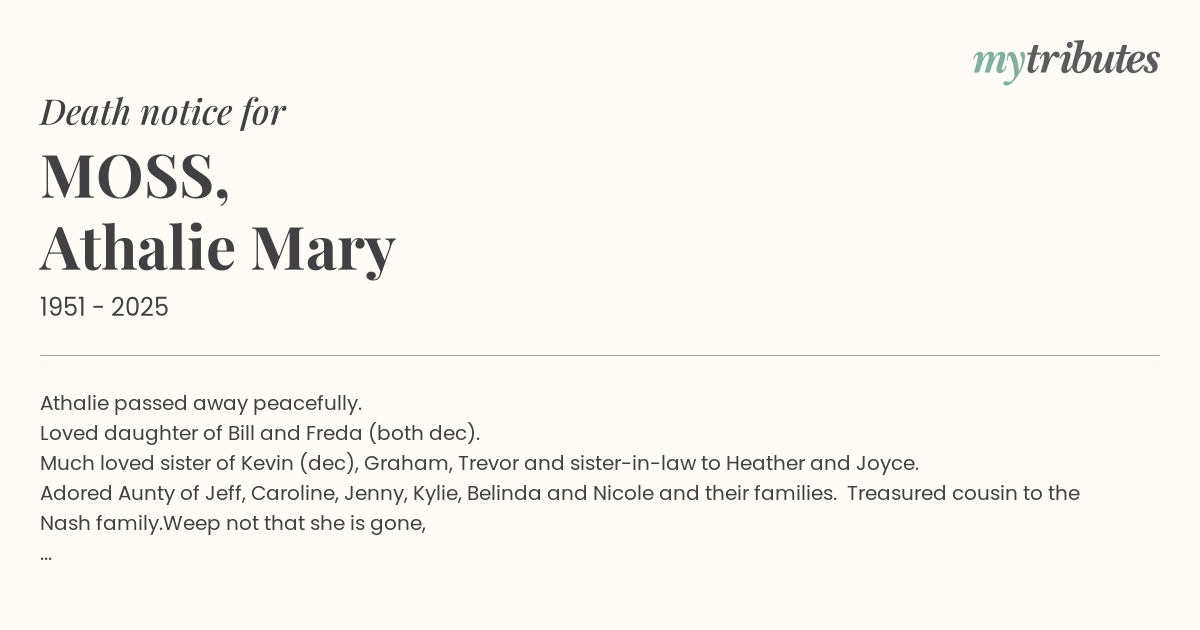 Athalie passed away peacefully. Loved daughter of Bill and Freda (both dec). Much loved sister of Kevin (dec), Graham, Trevor and sister-in-law to Heather and Joyce. Adored Aunty of Jeff, Caroline, Jenny, Kylie, Belinda and Nicole and their families. Treasured cousin to the Nash family.