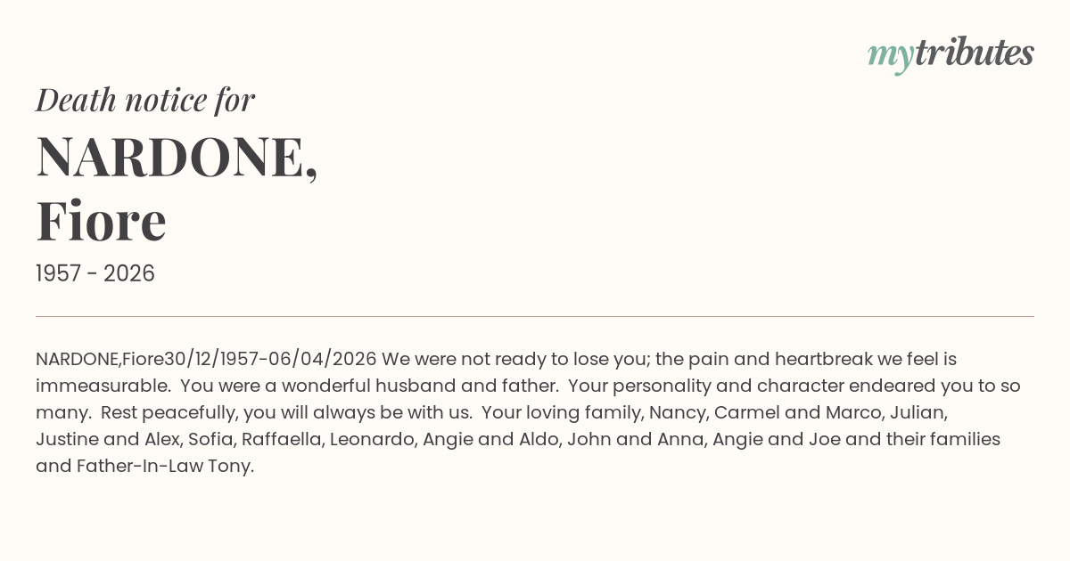 Your loving family, Nancy, Carmel and Marco, Julian, Justine and Alex, Sofia, Raffaella, Leonardo, Angie and Aldo, John and Anna, Angie and Joe and their families and Father-In-Law Tony.