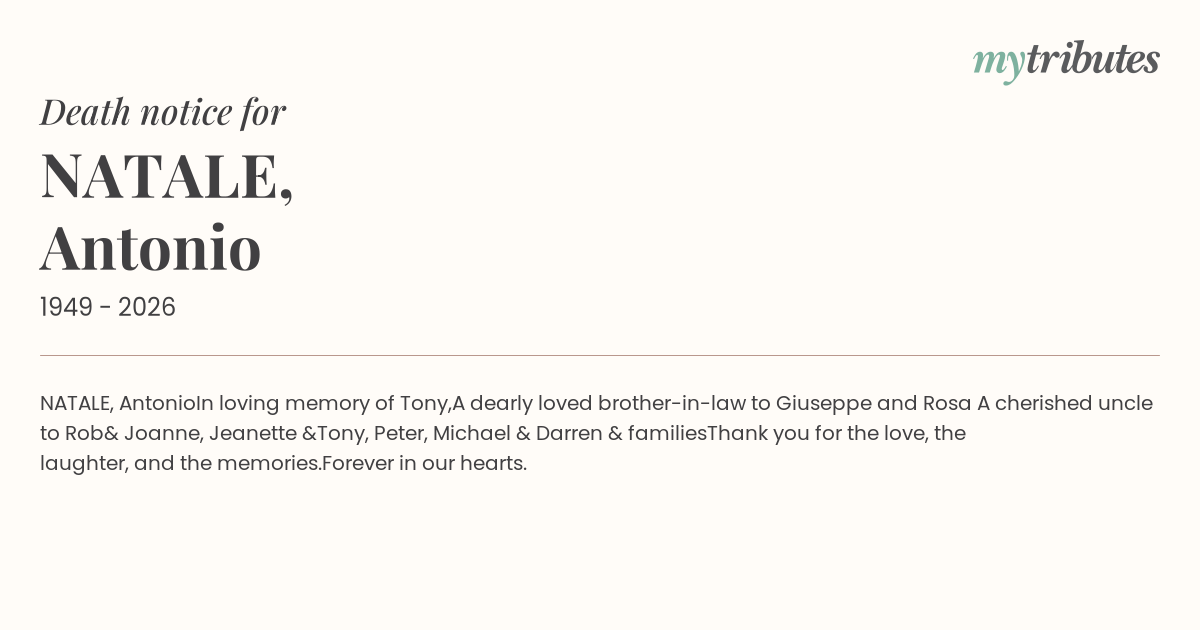 A cherished uncle to Rob& Joanne, Jeanette &Tony, Peter, Michael & Darren & families