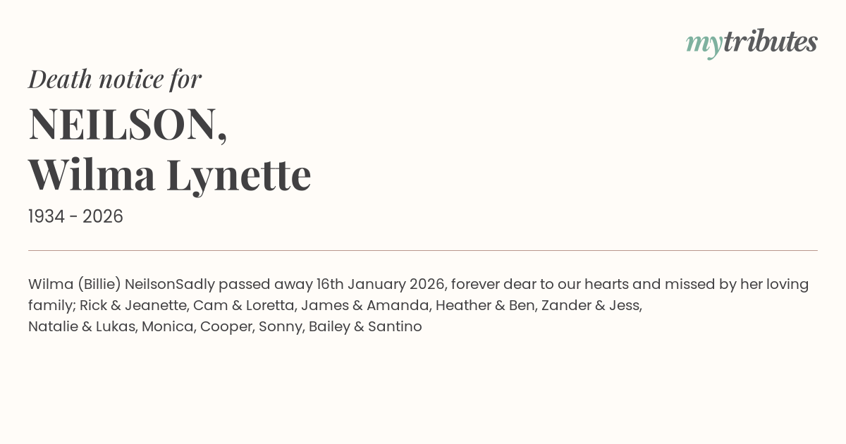 Sadly passed away 16th January 2026, forever dear to our hearts and missed by her loving family; Rick & Jeanette, Cam & Loretta, James & Amanda, Heather & Ben, Zander & Jess, Natalie & Lukas, Monica, Cooper, Sonny, Bailey & Santino