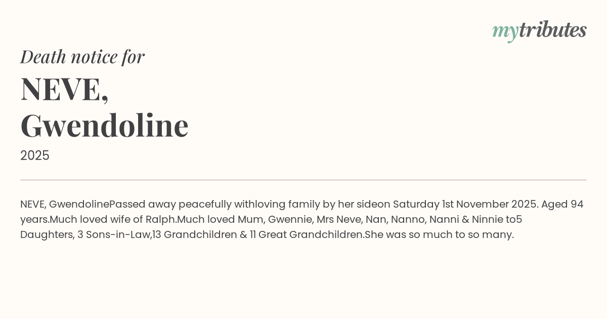 Much loved Mum, Gwennie, Mrs Neve, Nan, Nanno,