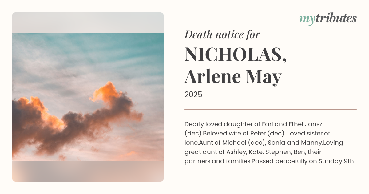 Family and friends are invited to join us to farewell Arlene, please refer to Memorial Services.