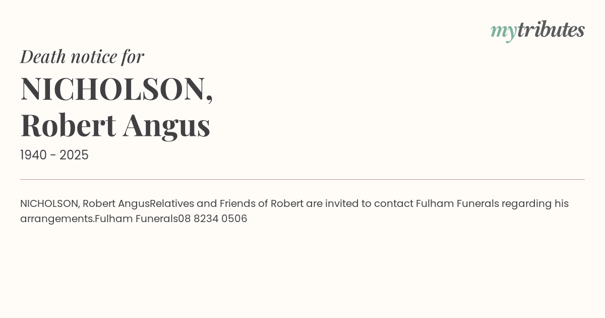 Relatives and Friends of Robert are invited to contact Fulham Funerals regarding his arrangements.