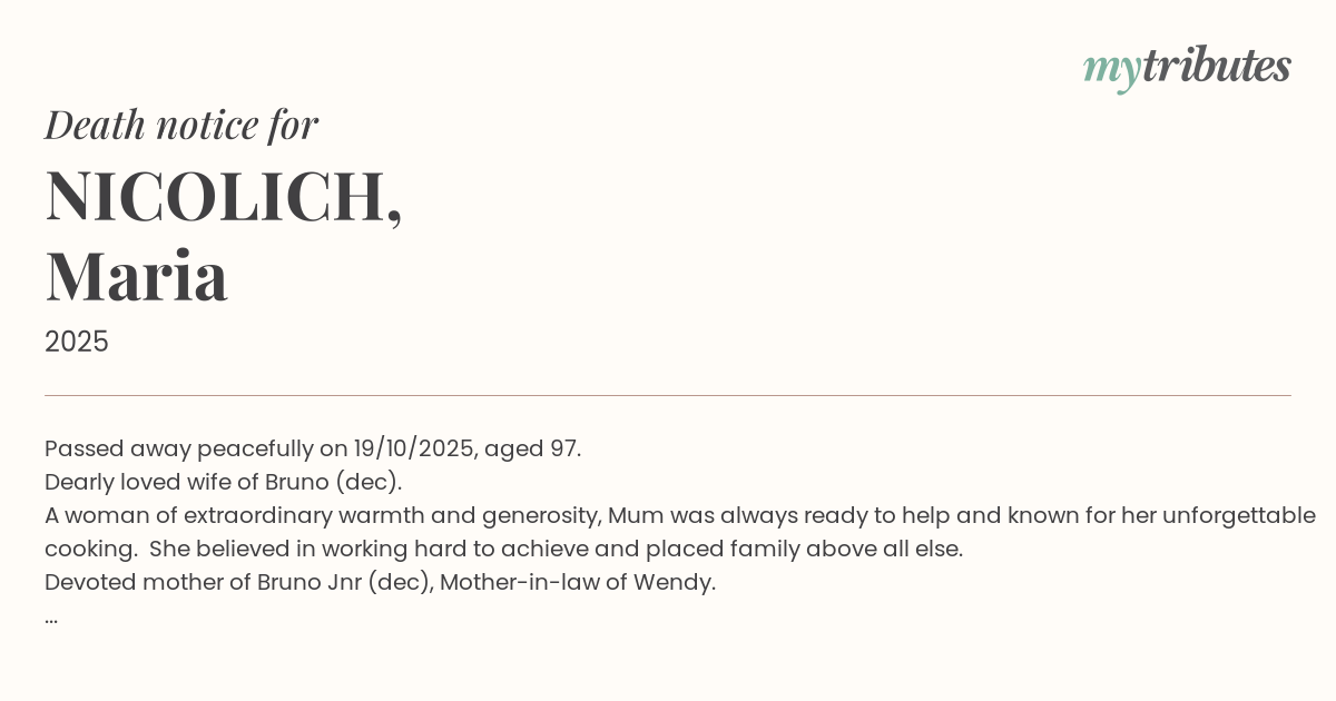 Passed away peacefully on 19/10/2025, aged 97.