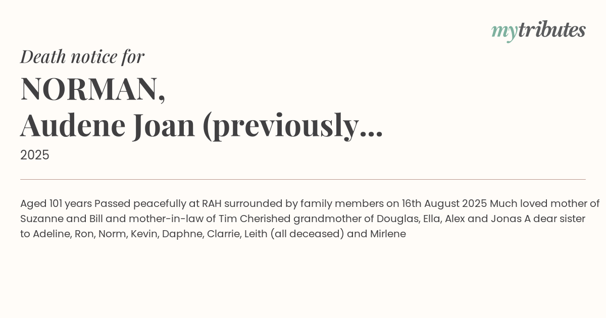 Passed peacefully at RAH surrounded by family members on 16th August 2025
