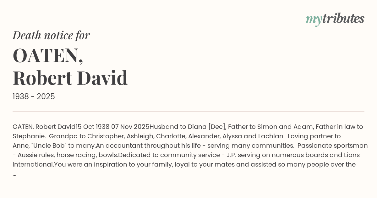 Husband to Diana [Dec], Father to Simon and Adam, Father in law to Stephanie. Grandpa to Christopher, Ashleigh, Charlotte, Alexander, Alyssa and Lachlan. Loving partner to Anne, "Uncle Bob" to many.