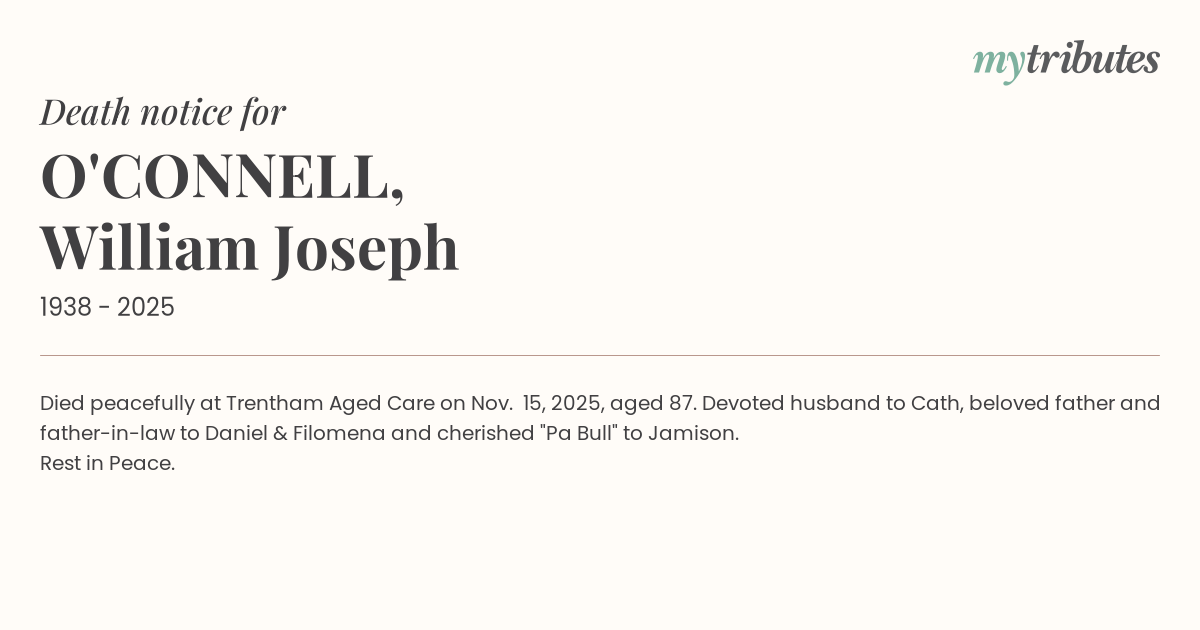 Died peacefully at Trentham Aged Care on Nov. 15, 2025, aged 87. Devoted husband to Cath, beloved father and father-in-law to Daniel & Filomena and cherished "Pa Bull" to Jamison.