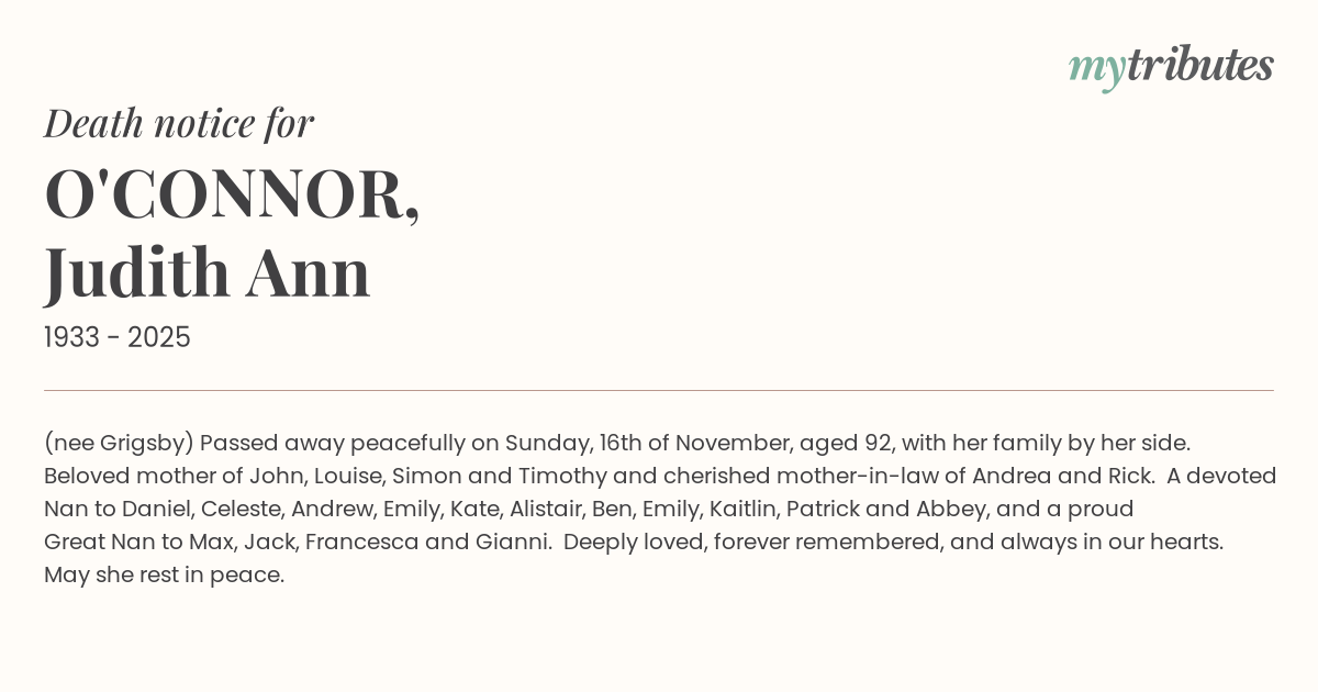 Beloved mother of John, Louise, Simon and Timothy and cherished mother-in-law of Andrea and Rick. A devoted Nan to Daniel, Celeste, Andrew, Emily, Kate, Alistair, Ben, Emily, Kaitlin, Patrick and Abbey, and a proud Great Nan to Max, Jack, Francesca and Gianni.