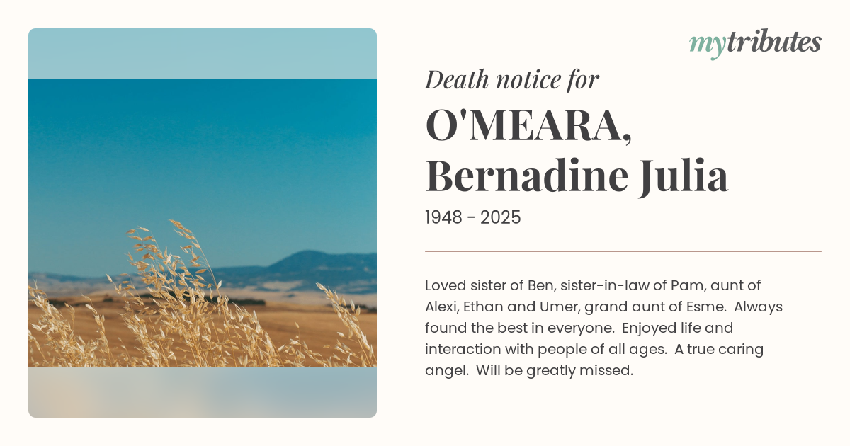 Loved sister of Ben, sister-in-law of Pam, aunt of Alexi, Ethan and Umer, grand aunt of Esme. Always found the best in everyone. Enjoyed life and interaction with people of all ages. A true caring angel. Will be greatly missed.