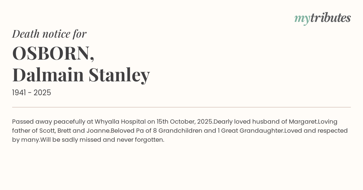Passed away peacefully at Whyalla Hospital on 15th October, 2025.