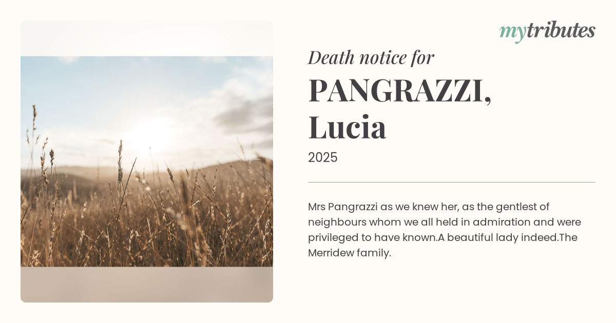 Mrs Pangrazzi as we knew her, as the gentlest of neighbours whom we all held in admiration and were privileged to have known.