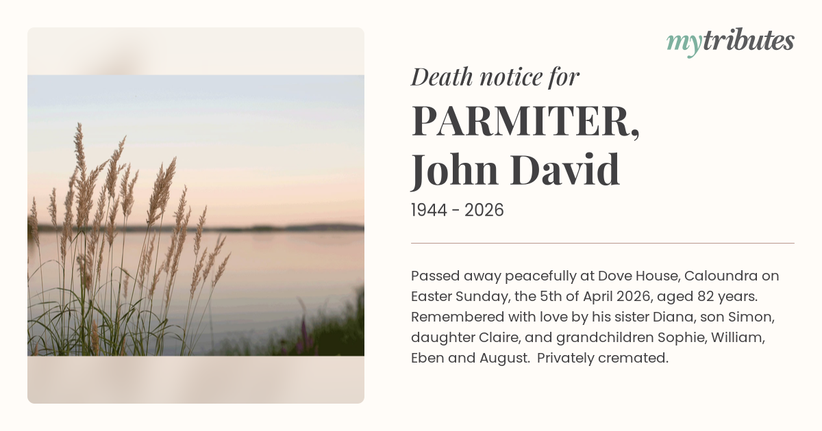 Passed away peacefully at Dove House, Caloundra on Easter Sunday, the 5th of April 2026, aged 82 years. Remembered with love by his sister Diana, son Simon, daughter Claire, and grandchildren Sophie, William, Eben and August. Privately cremated.