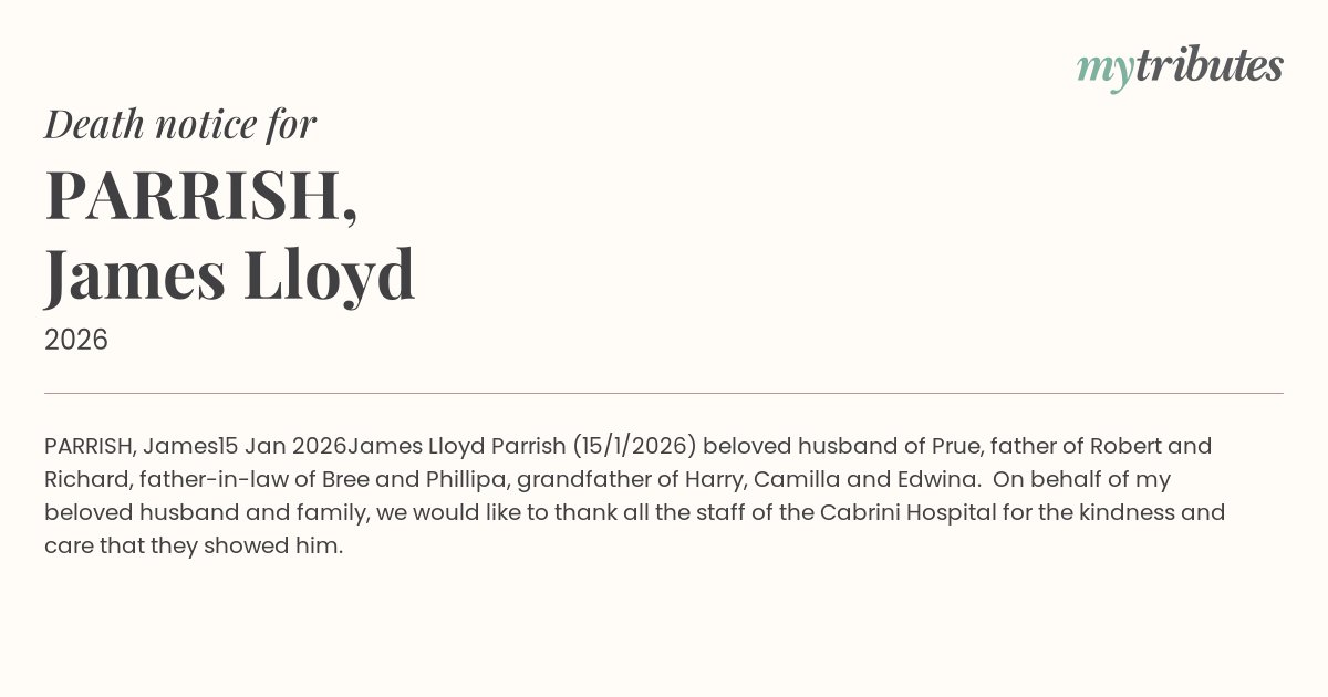 James Lloyd Parrish (15/1/2026) beloved husband of Prue, father of Robert and Richard, father-in-law of Bree and Phillipa, grandfather of Harry, Camilla and Edwina. On behalf of my beloved husband and family, we would like to thank all the staff of the Cabrini Hospital for the kindness and care that they showed him.