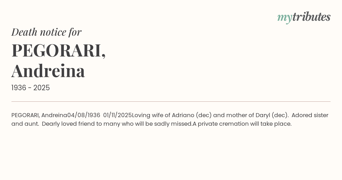 Loving wife of Adriano (dec) and mother of Daryl (dec). Adored sister and aunt.