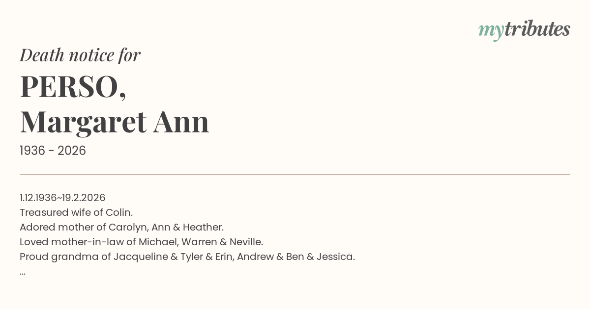 1.12.1936~19.2.2026 Treasured wife of Colin. Adored mother of Carolyn, Ann & Heather. Loved mother-in-law of Michael, Warren & Neville. Proud grandma of Jacqueline & Tyler & Erin, Andrew & Ben & Jessica. Great grandma of Teddy & Mackenzie. Special thanks to the staff at Monash Medical Centre. Thank you for everything you have given us. Fond memories always.