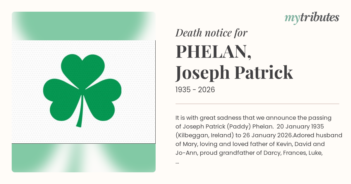 It is with great sadness that we announce the passing of Joseph Patrick (Paddy) Phelan. 20 January 1935 (Kilbeggan, Ireland) to 26 January 2026.