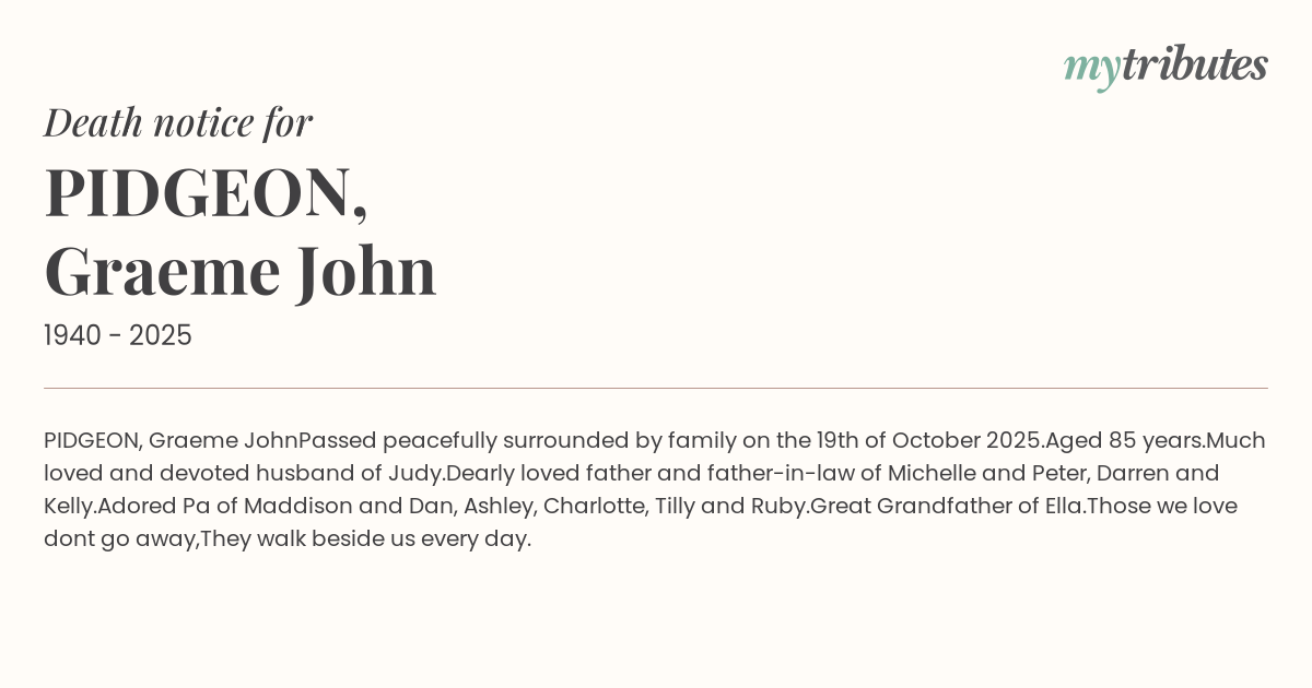 Passed peacefully surrounded by family on the 19th of October 2025.