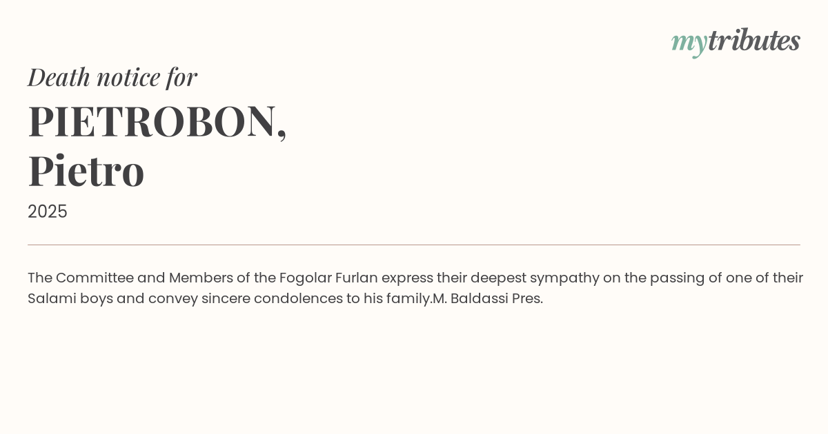 The Committee and Members of the Fogolar Furlan express their deepest sympathy on the passing of one of their Salami boys and convey sincere condolences to his family.