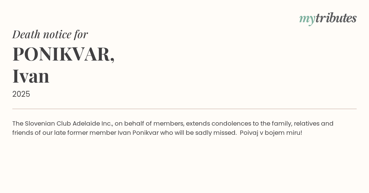 The Slovenian Club Adelaide Inc., on behalf of members, extends condolences to the family, relatives and friends of our late former member Ivan Ponikvar who will be sadly missed. Počivaj v božjem miru!