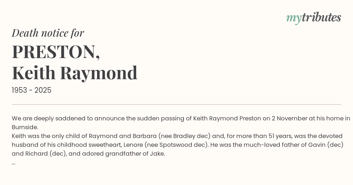 We are deeply saddened to announce the sudden passing of Keith Raymond Preston on 2 November at his home in Burnside.
