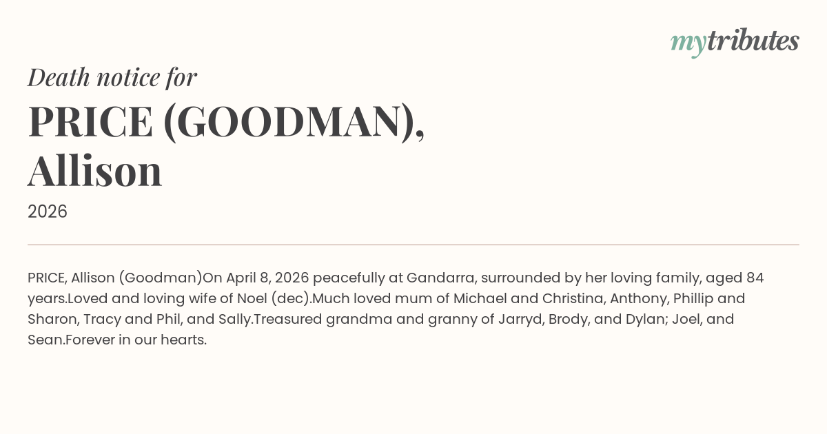 Much loved mum of Michael and Christina, Anthony, Phillip and Sharon, Tracy and Phil, and Sally.