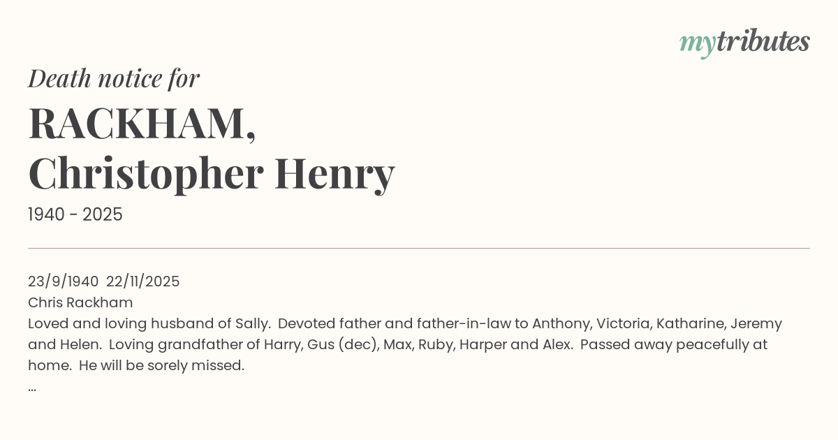 Loved and loving husband of Sally. Devoted father and father-in-law to Anthony, Victoria, Katharine, Jeremy and Helen. Loving grandfather of Harry, Gus (dec), Max, Ruby, Harper and Alex. Passed away peacefully at home. He will be sorely missed.