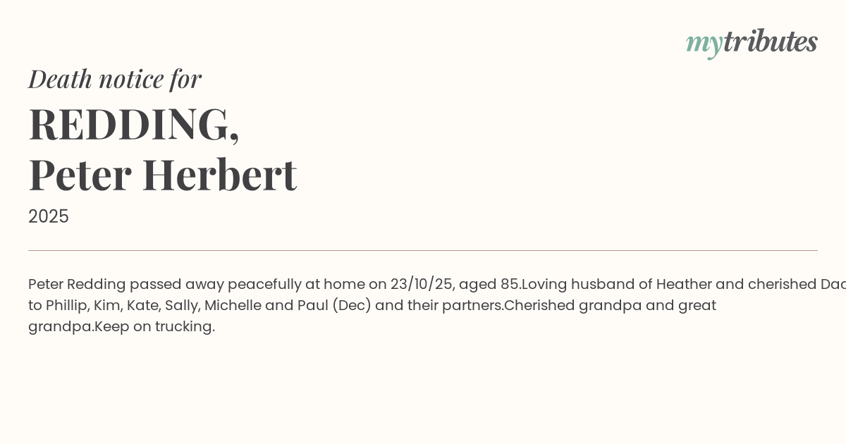 Peter Redding passed away peacefully at home on 23/10/25, aged 85.