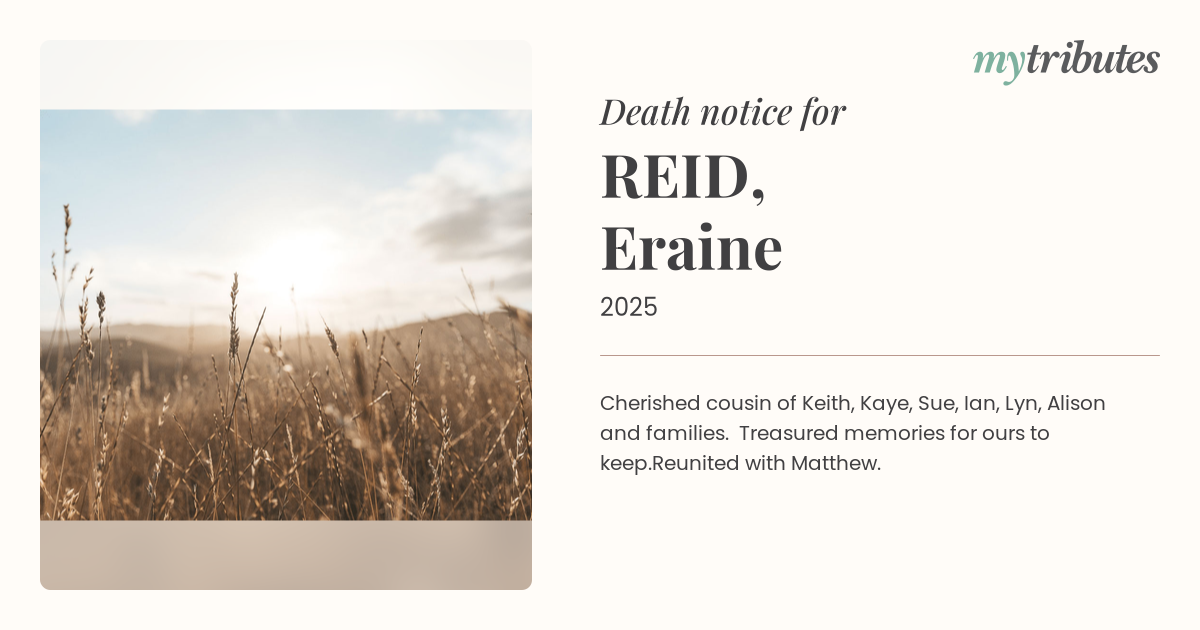 Cherished cousin of Keith, Kaye, Sue, Ian, Lyn, Alison and families.