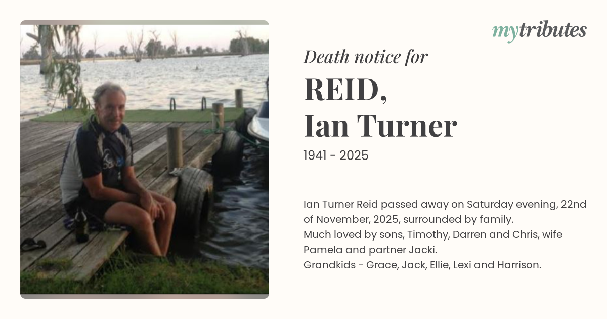 Ian Turner Reid passed away on Saturday evening, 22nd of November, 2025, surrounded by family. Much loved by sons, Timothy, Darren and Chris, wife Pamela and partner Jacki. Grandkids - Grace, Jack, Ellie, Lexi and Harrison.