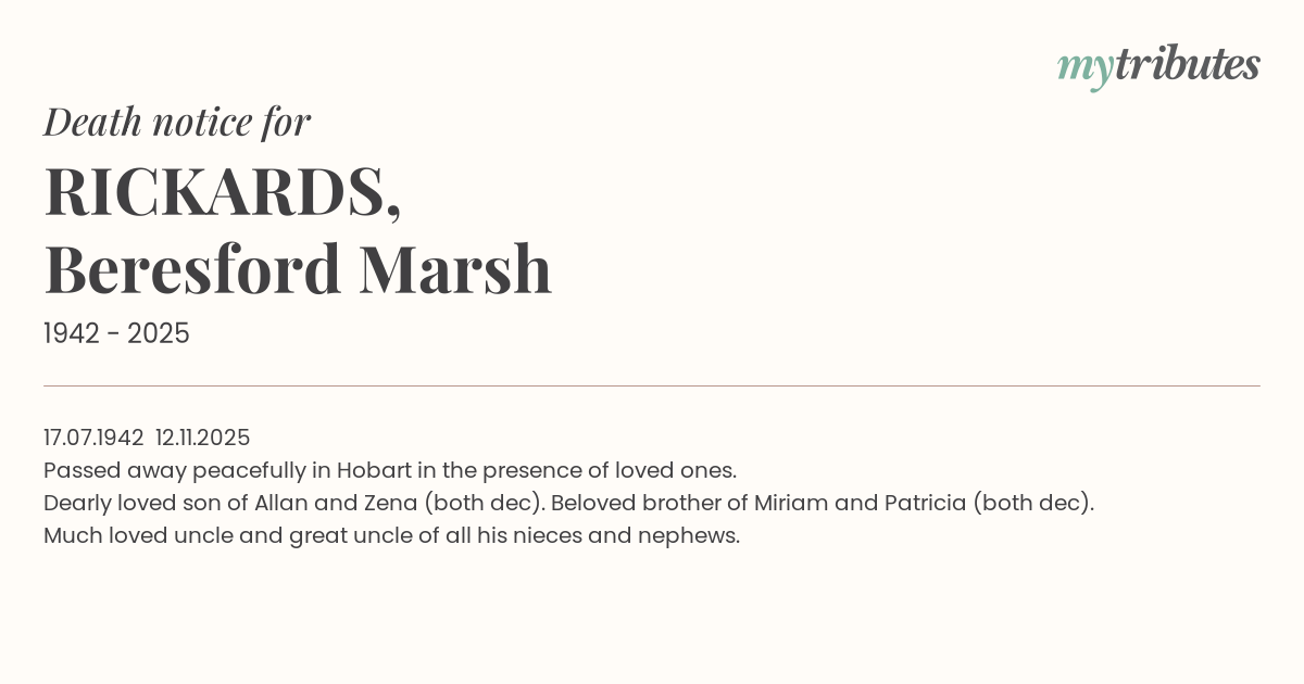 Dearly loved son of Allan and Zena (both dec). Beloved brother of Miriam and Patricia (both dec).