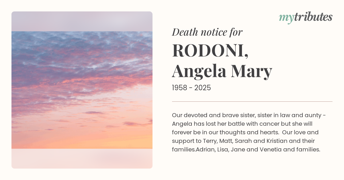 Our devoted and brave sister, sister in law and aunty - Angela has lost her battle with cancer but she will forever be in our thoughts and hearts. Our love and support to Terry, Matt, Sarah and Kristian and their families.