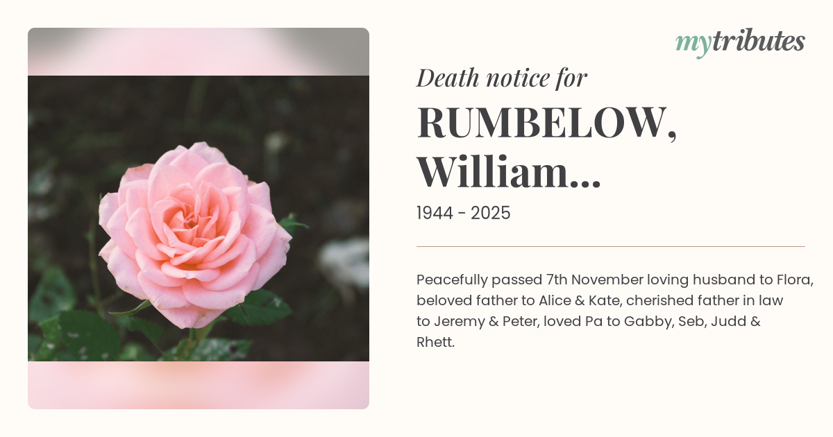 Peacefully passed 7th November loving husband to Flora, beloved father to Alice & Kate, cherished father in law to Jeremy & Peter, loved Pa to Gabby, Seb, Judd & Rhett.