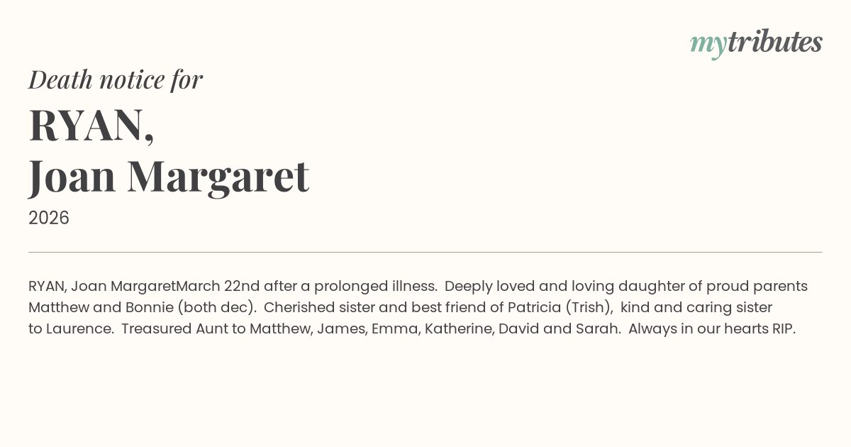 Cherished sister and best friend of Patricia (Trish), kind and caring sister to Laurence.