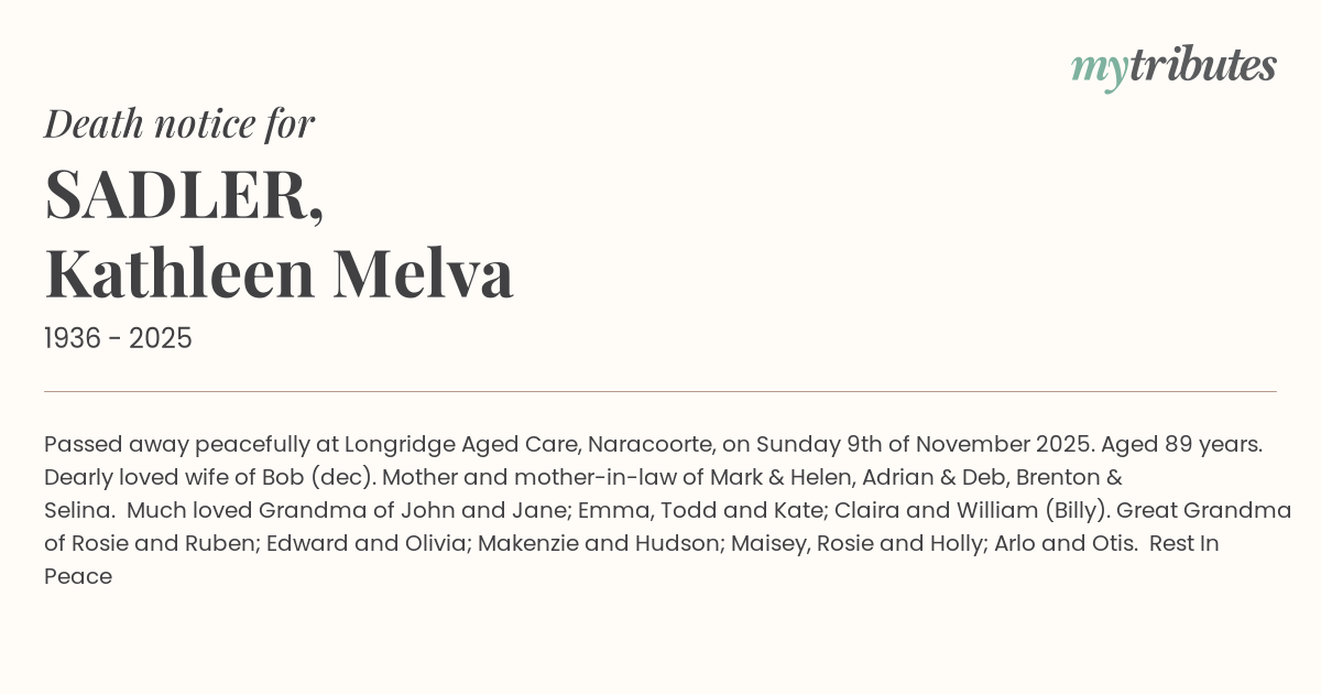 Passed away peacefully at Longridge Aged Care, Naracoorte, on Sunday 9th of November 2025. Aged 89 years. Dearly loved wife of Bob (dec). Mother and mother-in-law of Mark & Helen, Adrian & Deb, Brenton & Selina. Much loved Grandma of John and Jane; Emma, Todd and Kate; Claira and William (Billy). Great Grandma of Rosie and Ruben; Edward and Olivia; Makenzie and Hudson; Maisey, Rosie and Holly; Arlo and Otis. ‘Rest In Peace’