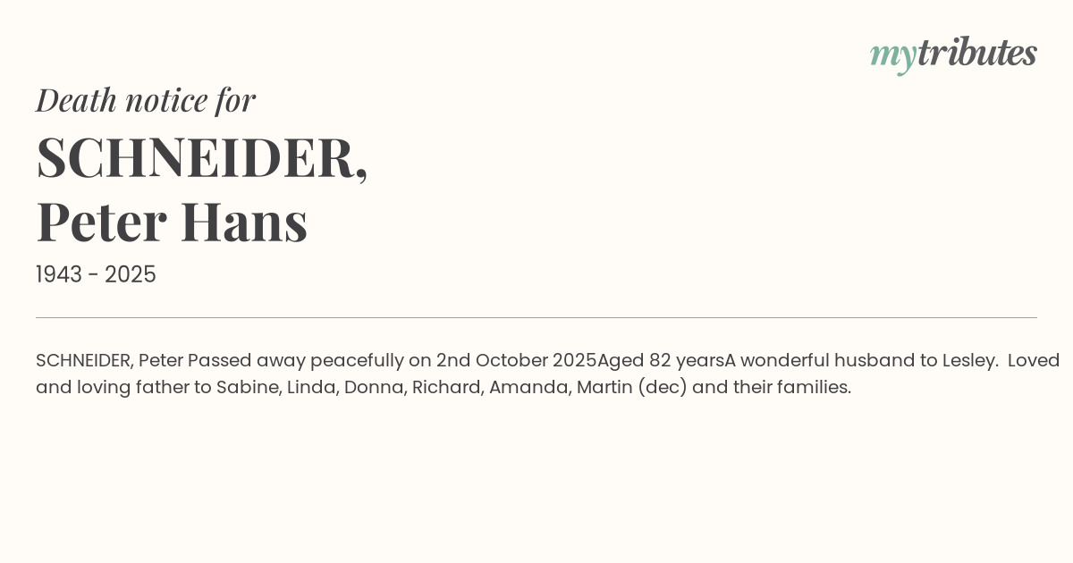 Loved and loving father to Sabine, Linda, Donna, Richard, Amanda, Martin (dec) and their families.