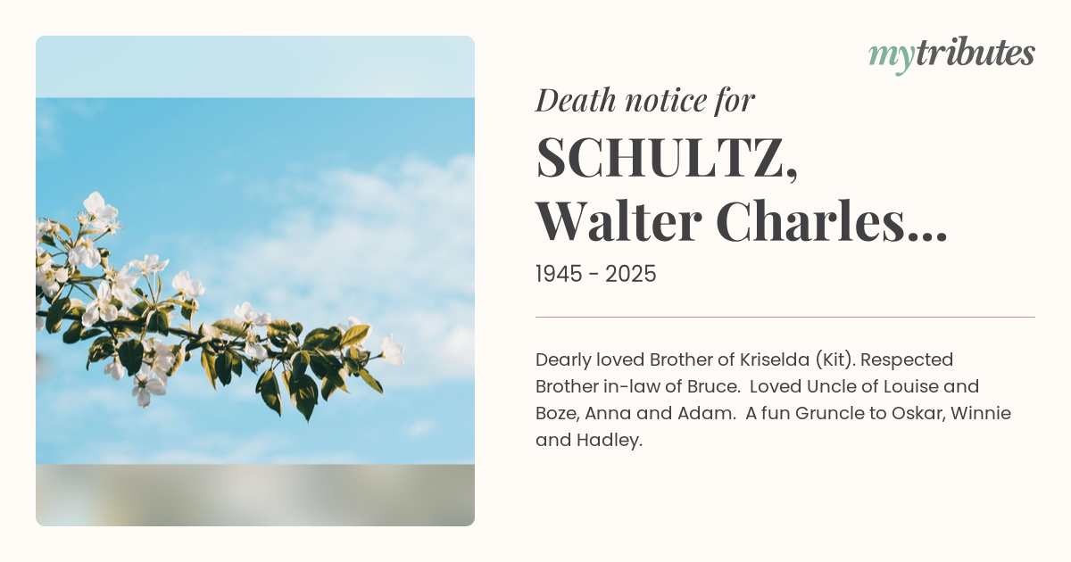 Dearly loved Brother of Kriselda (Kit). Respected Brother in-law of Bruce. Loved Uncle of Louise and Boze, Anna and Adam. A fun Gruncle to Oskar, Winnie and Hadley.